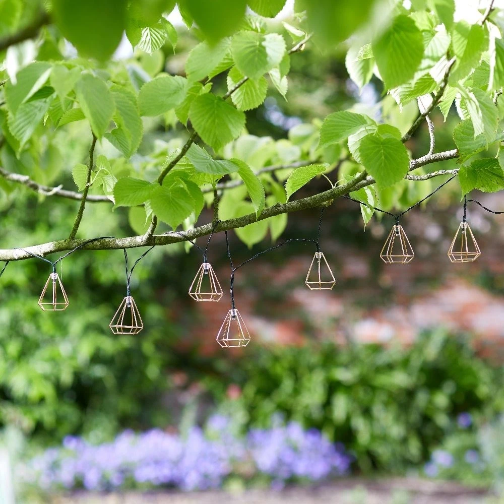String of 10 modern and minimal geometric solar LED lights. Ideal for adorning trees, shrubs, bushes, walls, fences and structures in contemporary gardens.