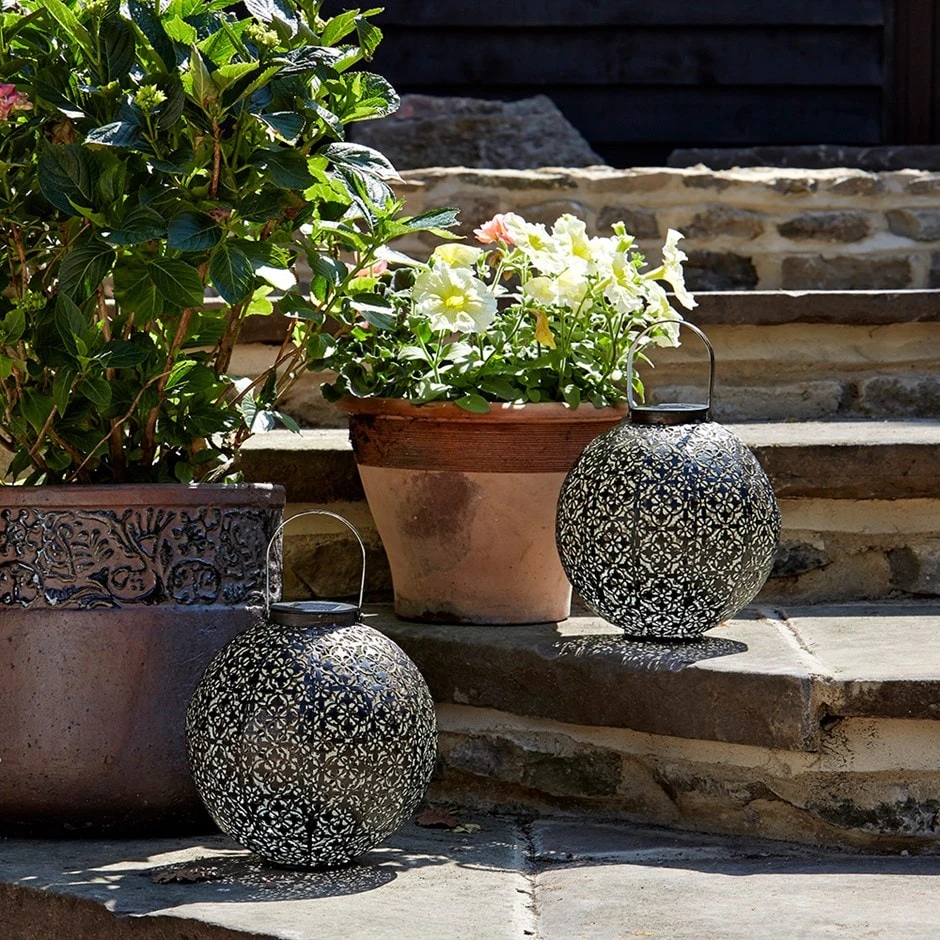 Create a magical atmosphere for outdoor entertaining with this Moroccan-style globe lantern. Recharging by day, it lights up automatically at night to bathe the garden in dappled light through the elegant apertures. Provides up to 6 hours of illumination on a full charge.