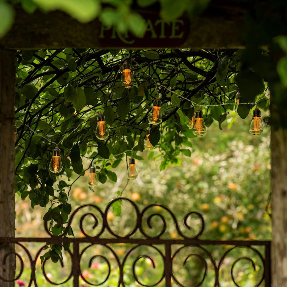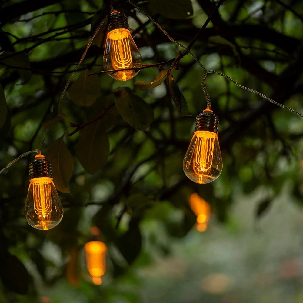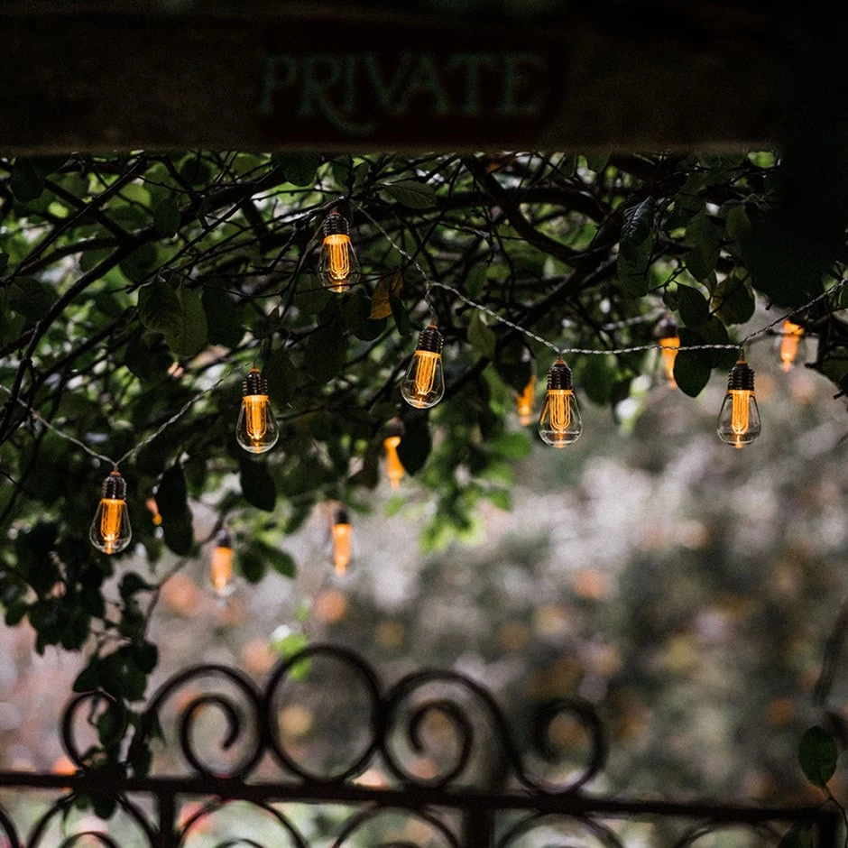 Connectable string of 10 vintage Edison-style bulb lights with warm amber white LEDs, suitable for indoor or outdoor use. Link up to 10 sets together and you can run them from a single transformer – perfect for large outdoor structures or fences.
