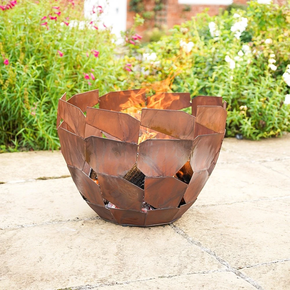 With an elegant petal-like design and rugged oxidised metal finish, this unique fire bowl brings striking contrast to the garden.