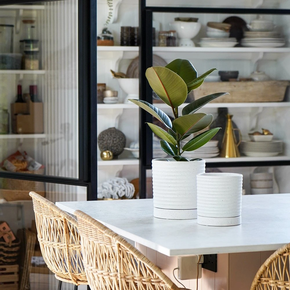 Made from stoneware, this matching white Luna pot and saucer set brings understated style to indoor plants. The ribbed sides and flecked finish add a subtle design accent while the premium reactive glaze makes each pot unique.