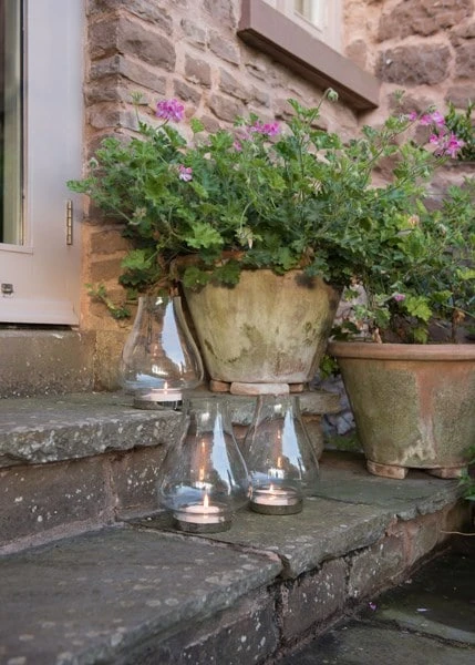 A classic outdoor dining candle or tealight holder made from clear blown glass with a nickel plated base.